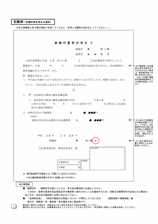 支払督促の申立をし、裁判所から支払督促が債務者に対して出されて、債務者が債務の返済もせず、また督促異議申立もしない場合には、仮執行宣言の申立をすることになります。